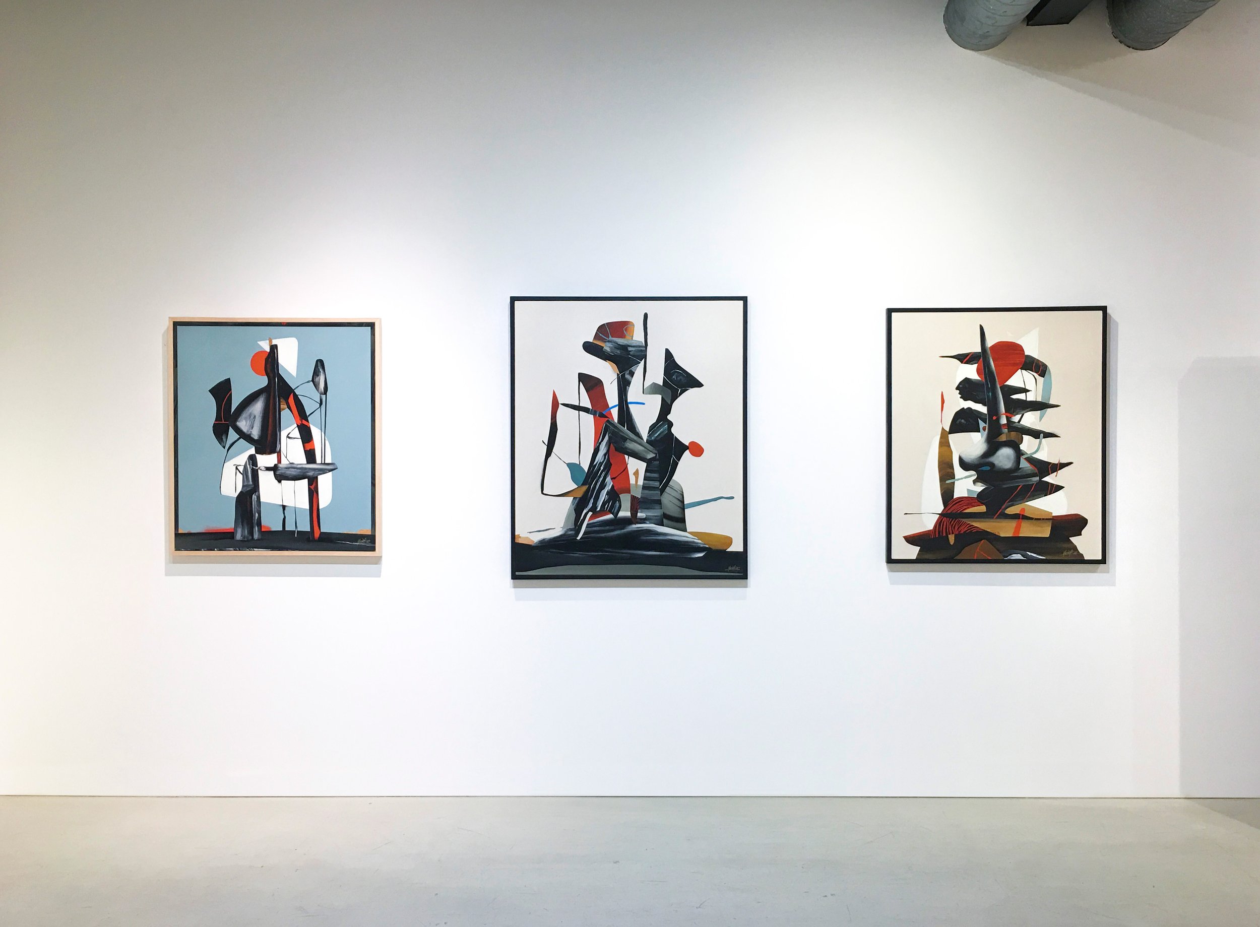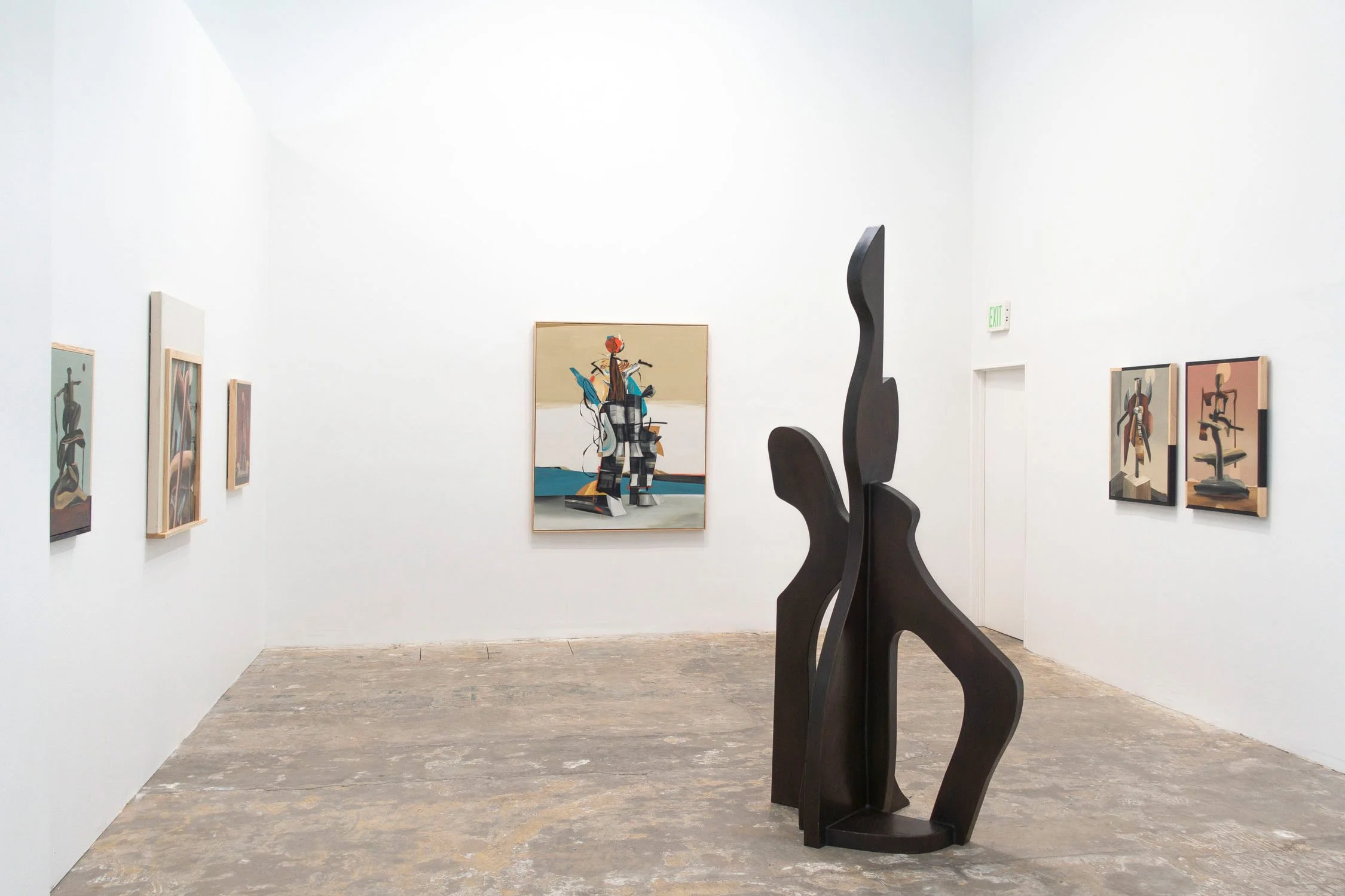 Among this suite of medium- to large-sized paintings, the Continuum series (I, II & III) makes a powerful impact with its repeated skull and flower imagery. Viewers peer through a transparent layer of ghostlike skulls (human, animal) to a second layer of delicately rendered flowers (roses, peonies) then even deeper to an explosive, silhouetted background of chaos that hints of classic graffiti tags. Serving as contemporary vanitas, these layers of wildly contrasting content and graphic styles resolve into complex, feeling-toned compositions. Kinsey’s portrait paintings, like King of Pop, Radio in a Box, Black Rain, and Man from Topanga, enlist these gripping contrasts in color, mark-making, and layering into finely tuned portrayals of emotional extremes. Where figures’ physical features are shut down or lack obvious expression, color and abstract forms serve to reveal and cathect underlying psychological states.